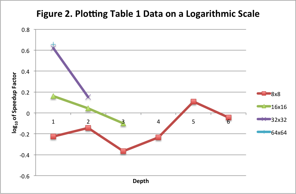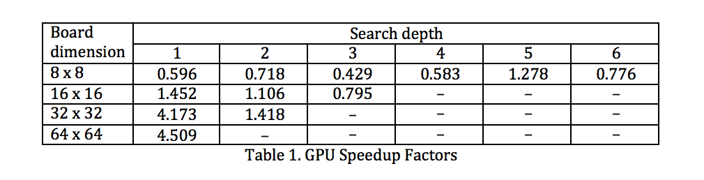 The PV-split algorithm works by first searching down one branch of the tree on the CPU, and then parallelizing the remaining nodes to be searched on the GPU. This allows the GPU branches to use the bounds from the first CPU-searched branch. Our first attempt to get a working parallel algorithm involved using one block of threads per child node, and then searching down the subtree rooted at that child node with the block. The results from this are summarized in the chart (Table 1) and graph (Figure 2) below.