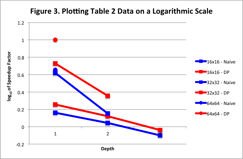 We launch our kernels with 1 block of 32 threads to reduce the use of the thread block scheduler of the GPU, which would reduce performance and to maximize the work done. Finally, to ensure that our kernels run concurrently, we launch our kernels into separate streams. However, actual concurrency of the kernels is not guaranteed [2]. Despite these uncertainties, we were able to see noticeable differences between the GPU speedup factor when using dynamic programming and our naive approach. Specifically, for larger boards and higher depths, dynamic parallelism results in a large speedup in comparison to the naive implementation. This behavior is to be expected since for larger boards / higher depths, we are able to hide the overhead of calling the kernels more since there are more positions on the game board for which to parallelize the computation of the score. The results from dynamic parallelism of the scoring are summarized in the chart (Table 2) and graph (Figure 3) below.