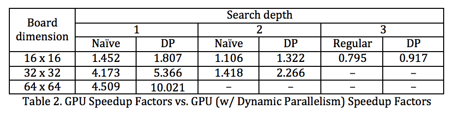 While our parallelized GPU algorithm was not faster than the CPU for a 8x8 board, it was significantly better than the CPU for larger board sizes. With additional optimizations such as dynamic parallelism of scoring game boards and full dynamic parallelism, we see that we can achieve up to a 10x speedup in comparison to the CPU. Additionally, due to limited CPU/GPU resources we did not run our algorithm to higher depths for the 32x32 and 64x64 game boards, but we would expect even greater speedups at higher depths [1]. Thus, using parallelization, we have made substantial improvements to the serialized version.